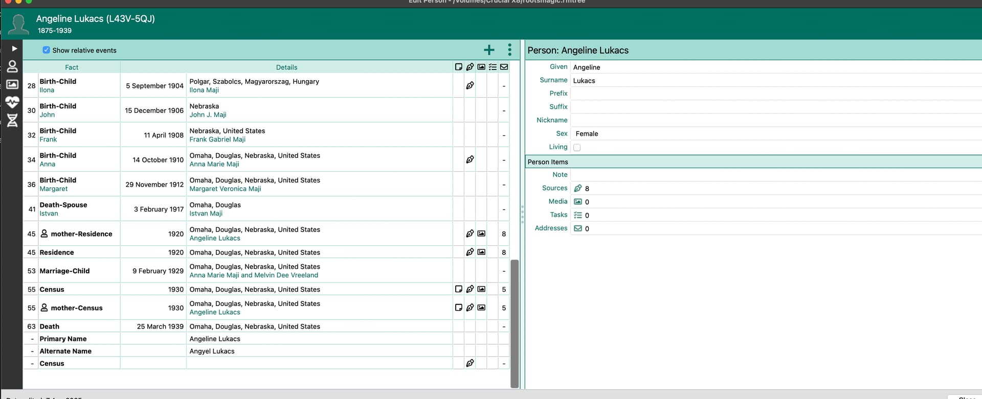 Letās just focus on the 1930 Census. One of the entries is a Census fact (the one that doesnāt say Mother). The other one is a shared role, namely the 1930 Census has been shared with the role of Mother. Typically, when a role is shared in this manner, it is shared with a different person. But it appears to me as if a 1930 Census fact (a real fact, not a share) has been entered for Angeline Lukasc, and then that same 1930 Census fact has been shared with Angeline Lukacs with the role of Mother. That is why you are seeing the duplication.